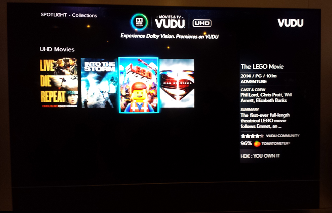 At the event, VIZIO had the 65-inch and 120-inch Reference Series TVs on display and, with the exception of some minor motion anomalies, they both looked rather magnificent. To demo the models' Dolby Vision support, VIZIO had 4K Dolby Vision content streaming from VUDU. The reel featured clips from several Warner Bros. titles, including 'The Lego Movie,' 'Edge of Tomorrow,' 'Into the Storm,' and 'Man of Steel.' Each film has been re-graded through the Dolby Vision process to support high dynamic range and wide colors by the studio… and the results were simply spectacular.