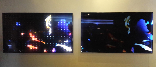 To highlight the display's impressive 384 local dimming zones, a special demo was offered that pitted the Reference Series against a competing edge-lit model. Both displays were hung side-by-side and each had their diffusers and light guides removed. A simple animation of fish swimming around the screen played on both sets, demonstrating the many active zones lighting up in specific sections of the panel on the VIZIO and the comparatively dim center and bright sides of the edge-lit model.