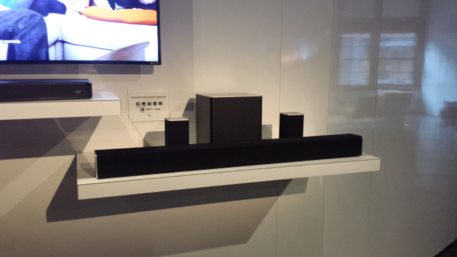 Finally, beyond all of the impressive TVs on hand, VIZIO also had an audio demo room to show off its new 2.1 sound stand, 40-inch soundbar, and integrated Reference Series audio system. The 2.1 soundstand ($250) is designed to slide right under the company's 2015 display lineup and can also sit comfortably under other TVs up to 55-inches in size and up to 60 pounds in weight. The speaker includes an integrated subwoofer for a low frequency response of 55 Hz. To demo the soundstand, a clip from 'Captain America: The Winter Solder' was played. While the tiny device offered an impressive, room-filling sound and some surprisingly aggressive bass activity, I found the stereo audio to be less distinct than I would have liked, leading to a slightly muddled presentation that lacked any real sense of directionality or separation. Of course, more time with the system is needed to really form a full opinion.