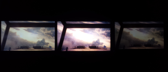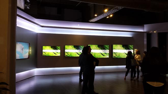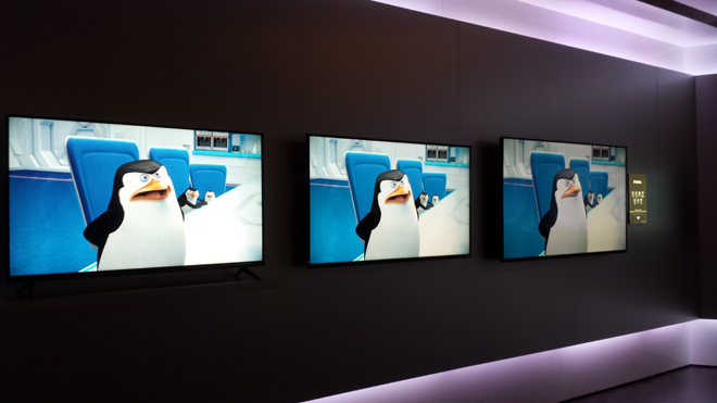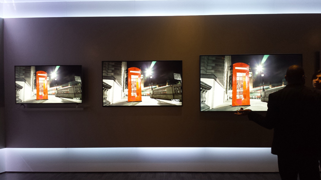 In addition to the main room displays, VIZIO also had a private demo room setup to directly compare the 65-inch Reference Series TV against two top competitors. In the pitch-black room, the Reference Series set was placed in the middle of a Samsung 8550 series Ultra HD TV and a Pioneer Kuro plasma HDTV (once heralded as one of the absolute best TVs on the market). The VUDU Dolby Vision reel was played on all three, highlighting the differences between contrast and colors between the displays and technologies.