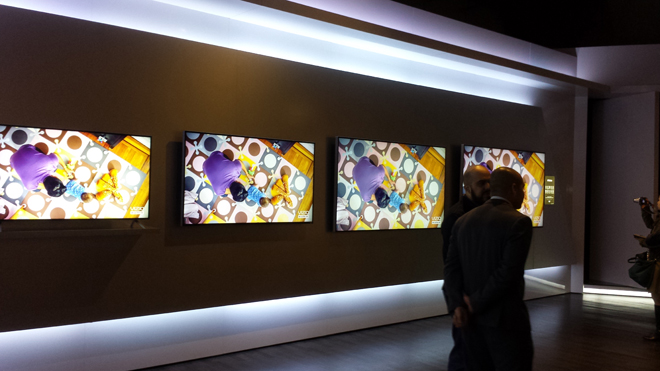 To further demonstrate the M-Series' superior black level performance, VIZIO also had a separate demo room with an M-series display side-by-side with a Samsung edge-lit Ultra HD model. Both TVs were playing a scene from one of Peter Jackson's 'Hobbit' films (sorry, they all blur together in my head). The difference between both technologies was readily apparent, with the Samsung appearing a bit more washed out and uneven with grey/blue blacks. Meanwhile, the VIZIO maintained a more uniform and deep shade of black, allowing the 2.35:1 bars to disappear into the dark of the room. Of course, both sets still use LCD tech, and picture quality did suffer a bit from off-angle viewing -- something that plasmas (may they rest in peace) and OLEDs (may they soon come down in price) handle much better.